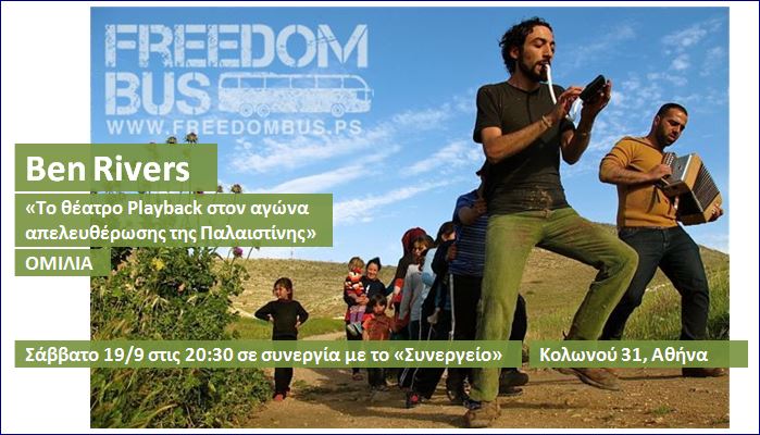 Όσοι ενδιαφέρονται να ακούσουν τον Ben Rivers να παρουσιάζει την προσφορά του θεάτρου στην ενδυνάμωση της κοινότητας, θα έχουν την ευκαιρία να παρακολουθήσουν την ομιλία του με θέμα “ Το Θέατρο Playback στον αγώνα απελευθέρωσης της Παλαιστίνης”, όπου θα μιλήσει για την πρωτοβουλία του Freedom Theater “Freedom Bus” και τη χρήση του Θεάτρου Playback ως μέσο ενδυνάμωσης, ευαισθητοποίησης και πολιτικής αλλαγής στην κατεχόμενη Παλαιστίνη.