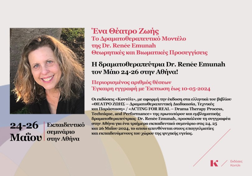 Οι εκδόσεις «Κοντύλι», με αφορμή την έκδοση στα ελληνικά του βιβλίου «ΘΕΑΤΡΟ ΖΩΗΣ – Δραματοθεραπευτική Διαδικασία, Τεχνικές και Παράσταση» /«ACTINGFORREAL–Drama Therapy Process, Technique, and Performance» της πρωτοπόρου και εμβληματικής δραματοθεραπεύτριας Dr. Renée Emunah*, προσκάλεσε τη συγγραφέα στην Αθήνα για ένα τριήμερο εκπαιδευτικό σεμινάριο στις 24,25 και 26 Μαΐου 2024, το οποίο απευθύνεται στους επαγγελματίες και εκπαιδευόμενους του χώρου της ψυχικής υγείας.