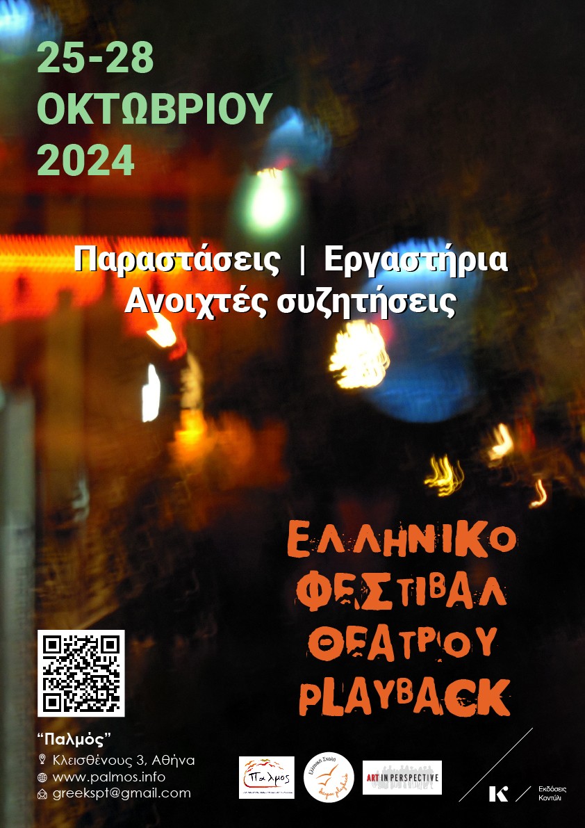 We celebrate the 20th anniversary of our company’s creative activities «Playback Ψ» (2004 – 2024), with the first Greek Playback Theatre Festival in Athens. The festival will take place at the venue of the Association of Dramatic Expression and Therapy «Palmos», 3 Kleisthenous Street, Athens, Greece, October 25 -28/ 2024.