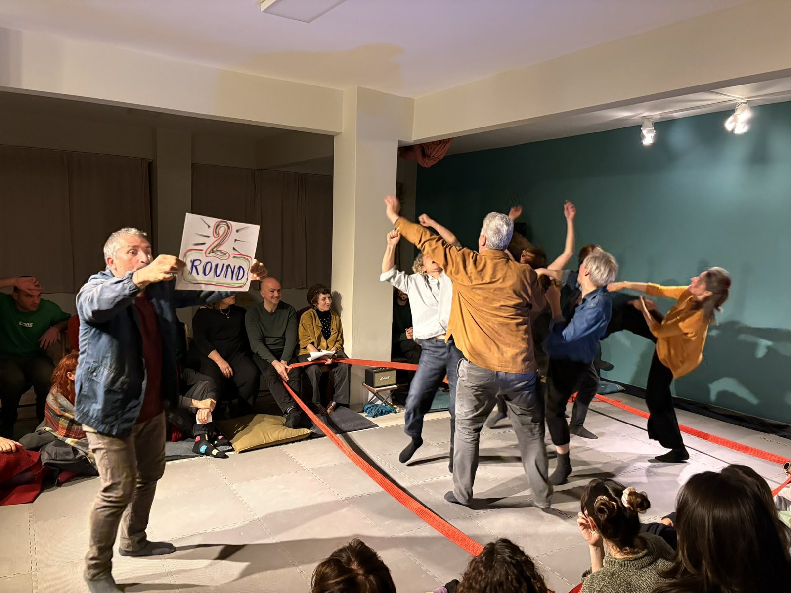 Σε ένα χαρτί του μέτρου, επάνω σε μια μεγάλη επιφάνεια, καταγράφθηκαν αυτές οι απόψεις και στη συνέχεια οι θεατές τις περιεργάστηκαν, διαβάζοντάς τις στη σιωπή. Στη συνέχεια, επέστρεψαν στις θέσεις τους και οι ηθοποιοί διάβασαν δυνατά αυτές τις λέξεις και ξεκίνησε ένα αυτοσχεδιαστικό παιχνίδι μεταξύ τους.